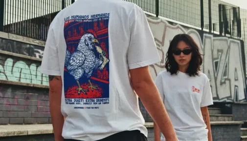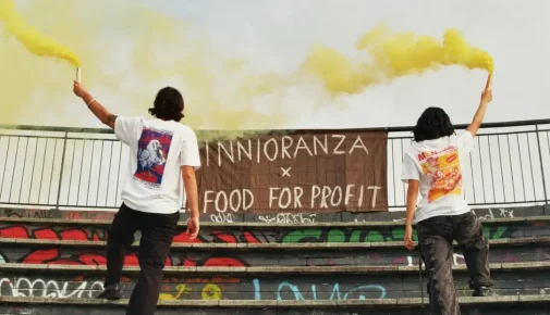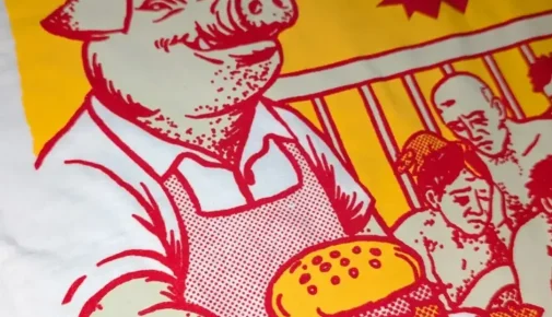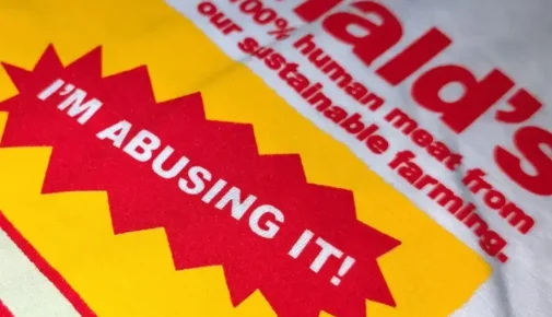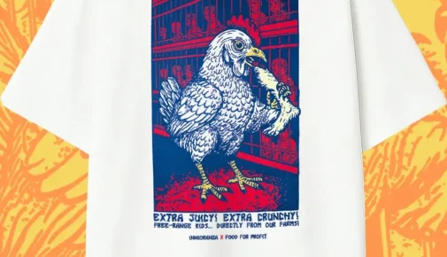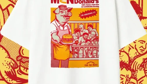 Le T-shirt nascono in collaborazione con l’artista e illustratore Innioranza, che ha mescolato il nostro stile con l’immaginario dei fast food, reali e inventati, per creare delle pubblicità che rappresentassero la cruda realtà degli allevamenti intensivi, mettendoci dentro persone e animali ma a ruoli inversi.