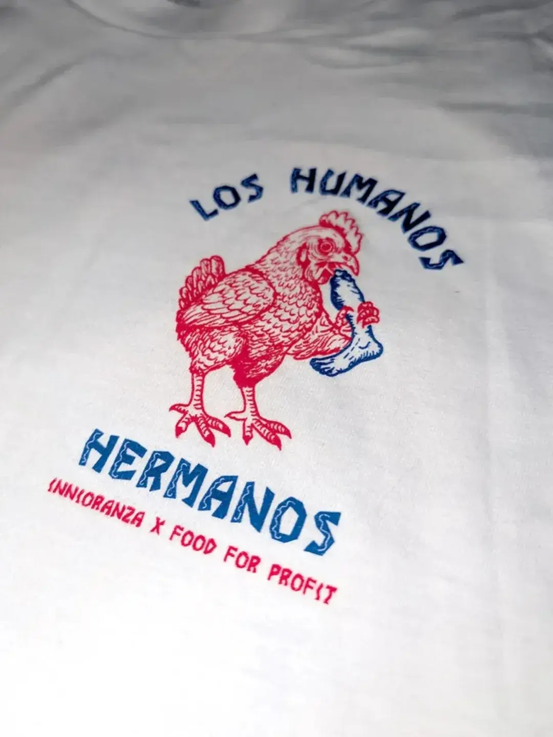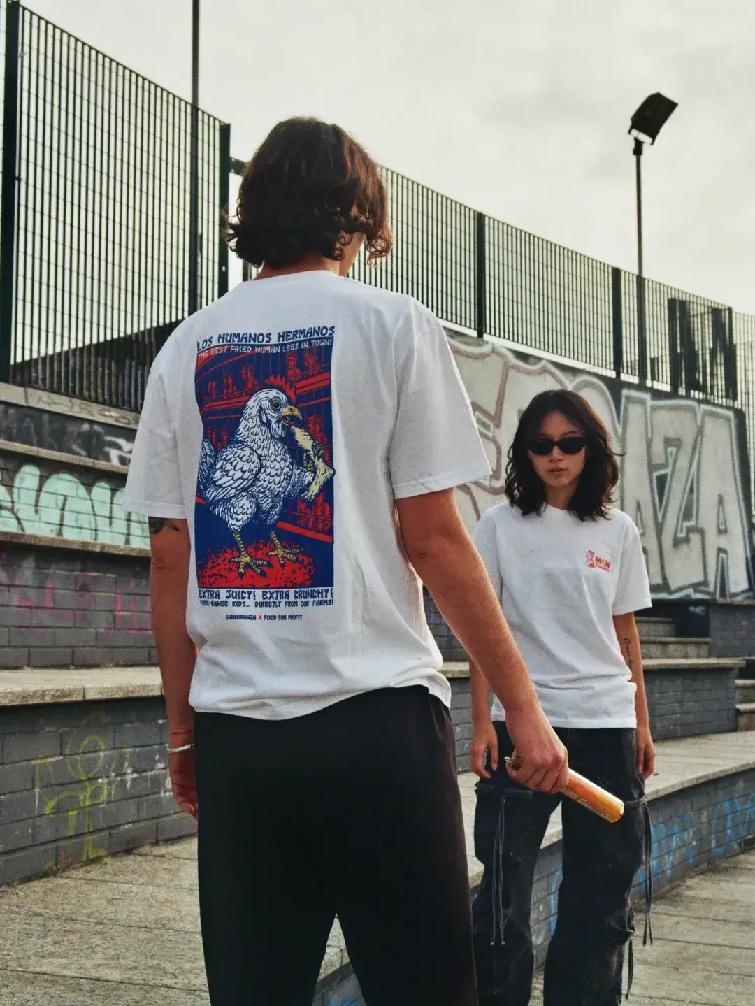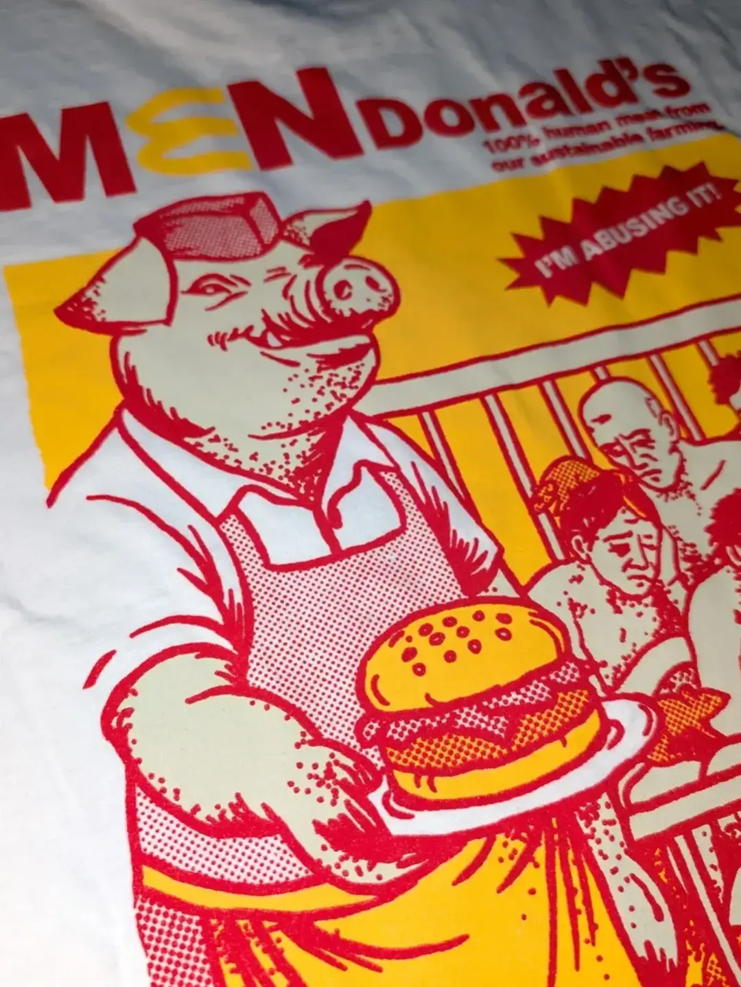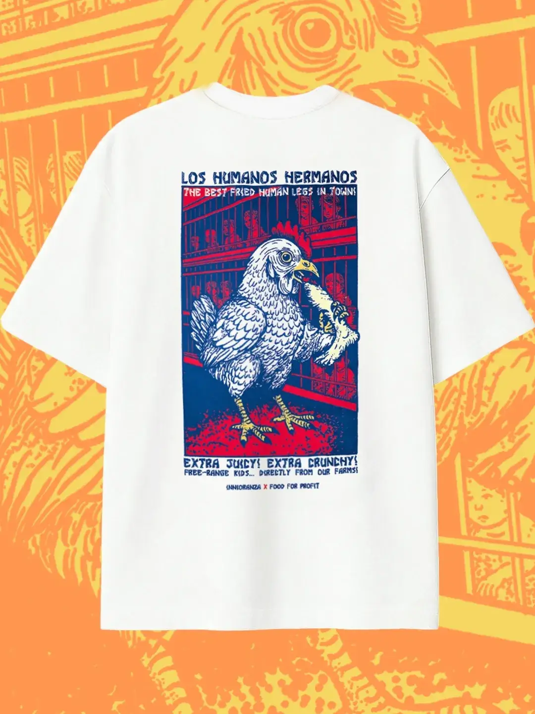 Le T-shirt nascono in collaborazione con l’artista e illustratore Innioranza, che ha mescolato il nostro stile con l’immaginario dei fast food, reali e inventati, per creare delle pubblicità che rappresentassero la cruda realtà degli allevamenti intensivi, mettendoci dentro persone e animali ma a ruoli inversi.