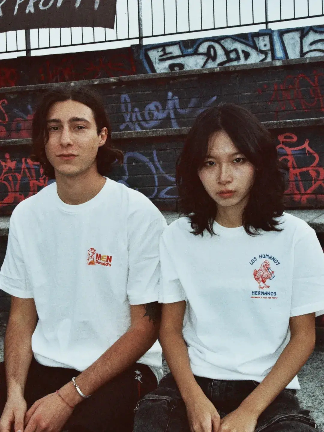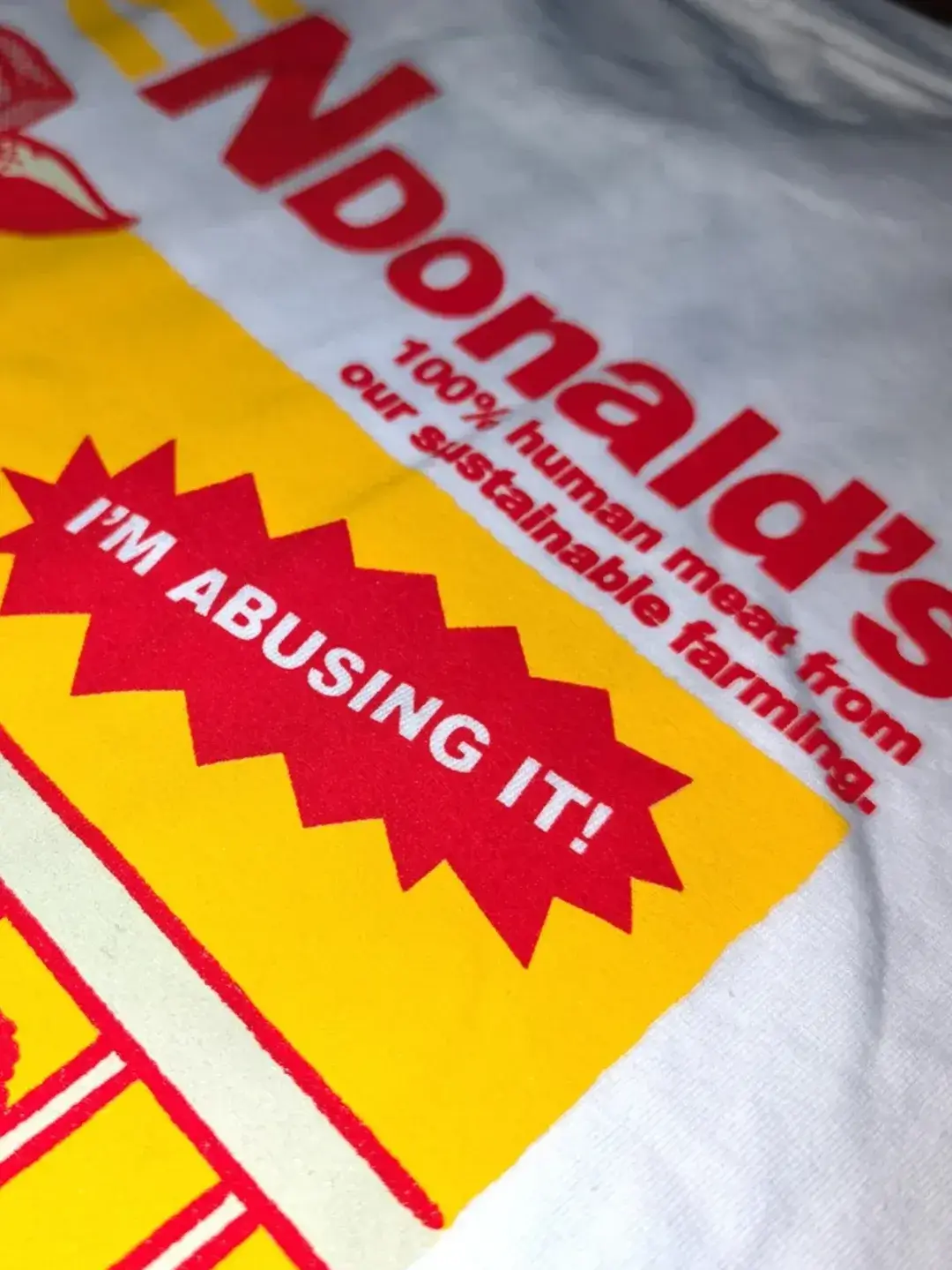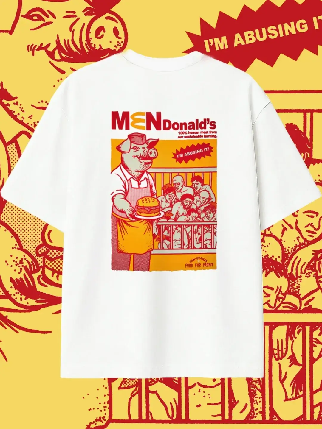 Le T-shirt nascono in collaborazione con l’artista e illustratore Innioranza, che ha mescolato il nostro stile con l’immaginario dei fast food, reali e inventati, per creare delle pubblicità che rappresentassero la cruda realtà degli allevamenti intensivi, mettendoci dentro persone e animali ma a ruoli inversi.