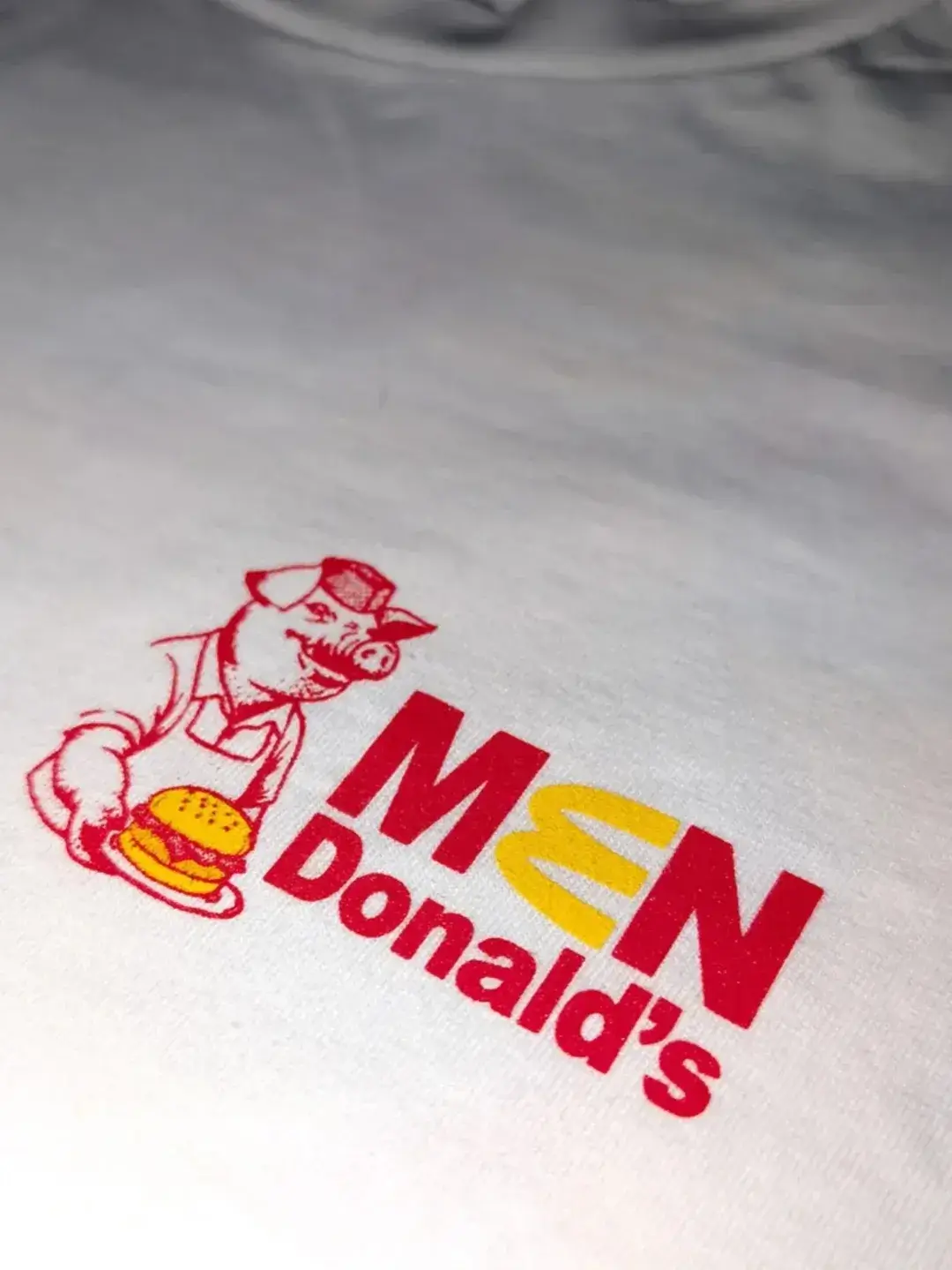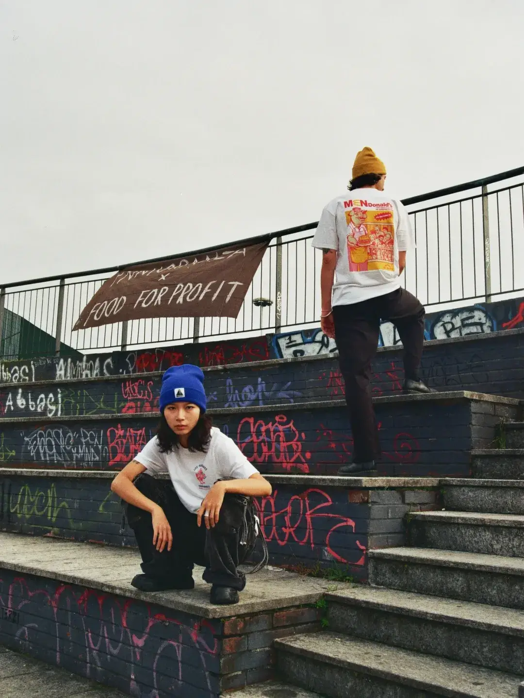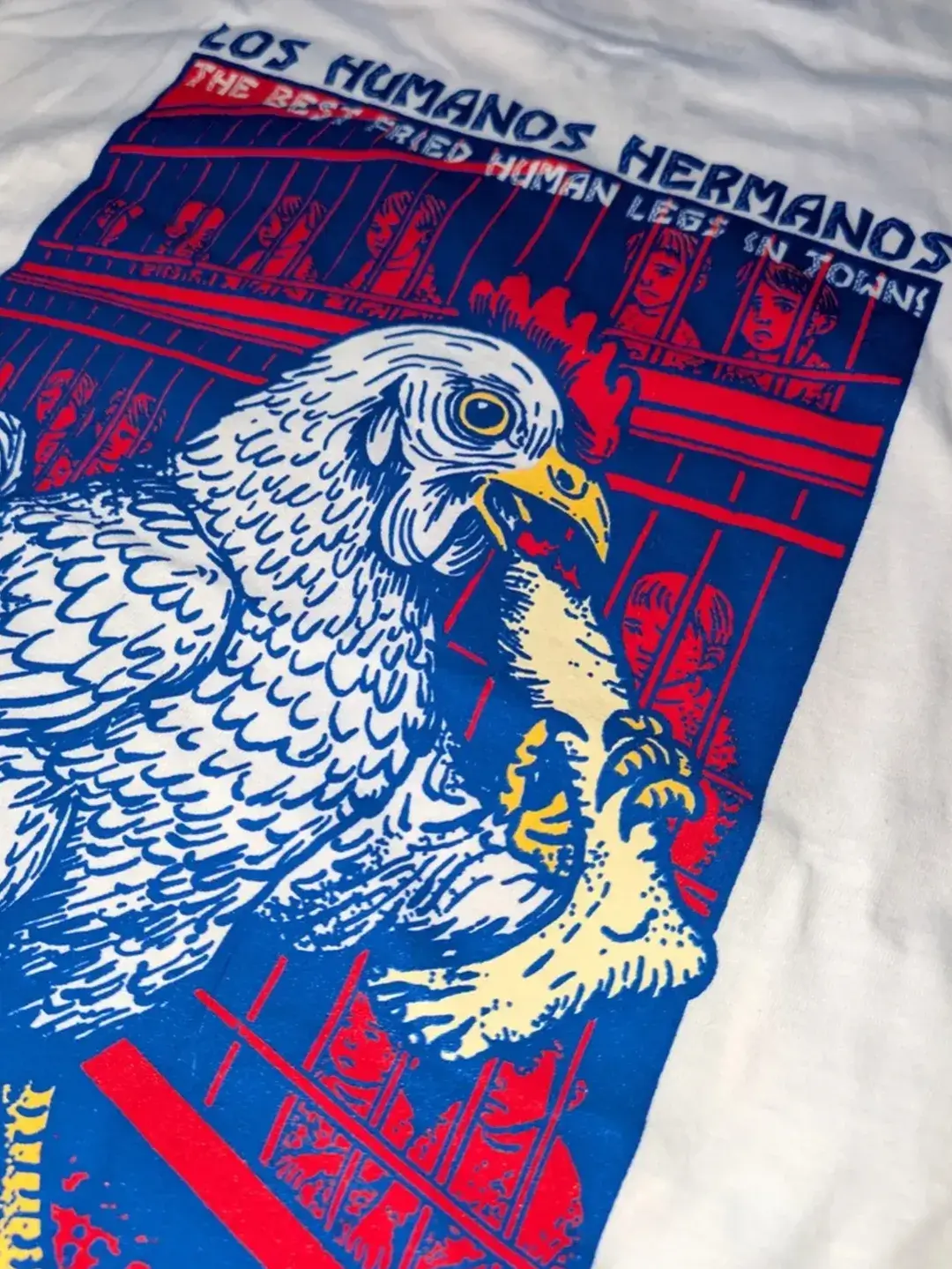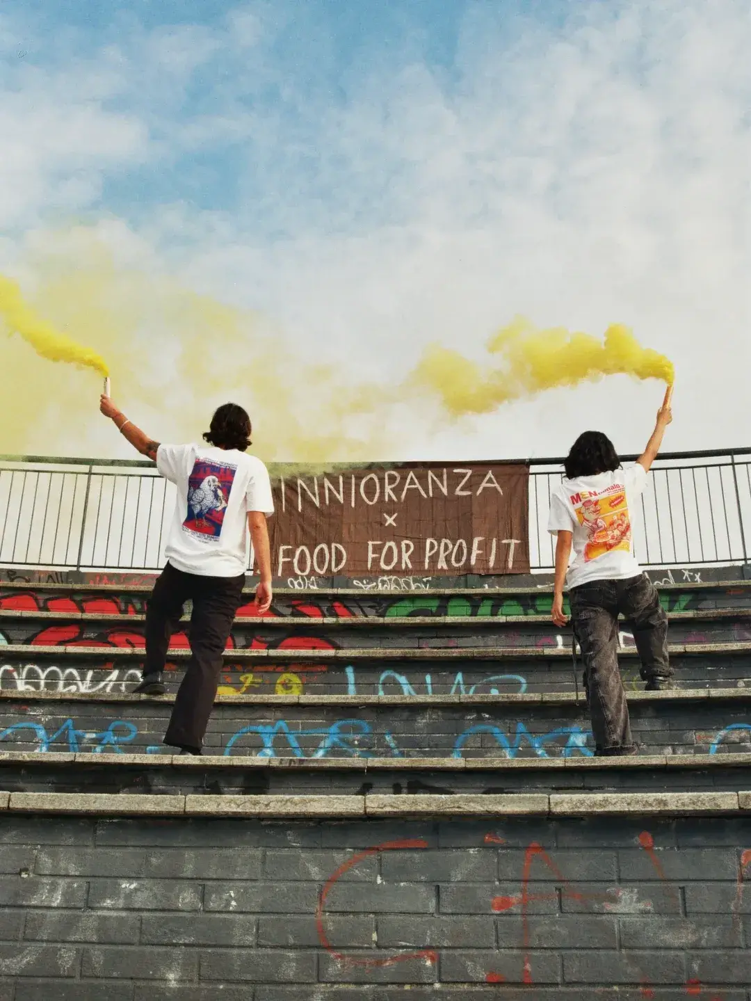 Le T-shirt nascono in collaborazione con l’artista e illustratore Innioranza, che ha mescolato il nostro stile con l’immaginario dei fast food, reali e inventati, per creare delle pubblicità che rappresentassero la cruda realtà degli allevamenti intensivi, mettendoci dentro persone e animali ma a ruoli inversi.